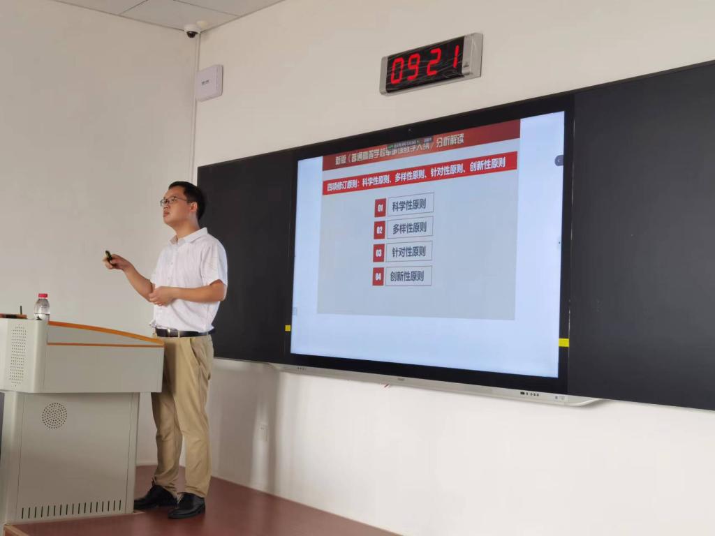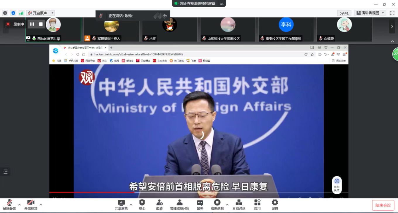活动采用线上线下结合的方式,邀请校内4位教学经验丰富的军事理论课授课教师进行交流分享。首先,学生工作处(部)李雷老师为大家解读了军事理论课最新版大纲,并结合自身教学实际,分享了“如何上好军事理论课”经验。随后,学生工作处(部)朱景星老师以国防概述为例,从“是什么、为什么、怎么学”三个方面分享了备课及教学经验。最后,济南校区财经系陈帅老师和泰安校区学团工作部李科老师分别围绕“国家安全形势”和“古代军事思想”进行了示范授课。