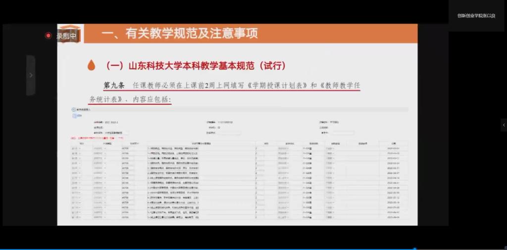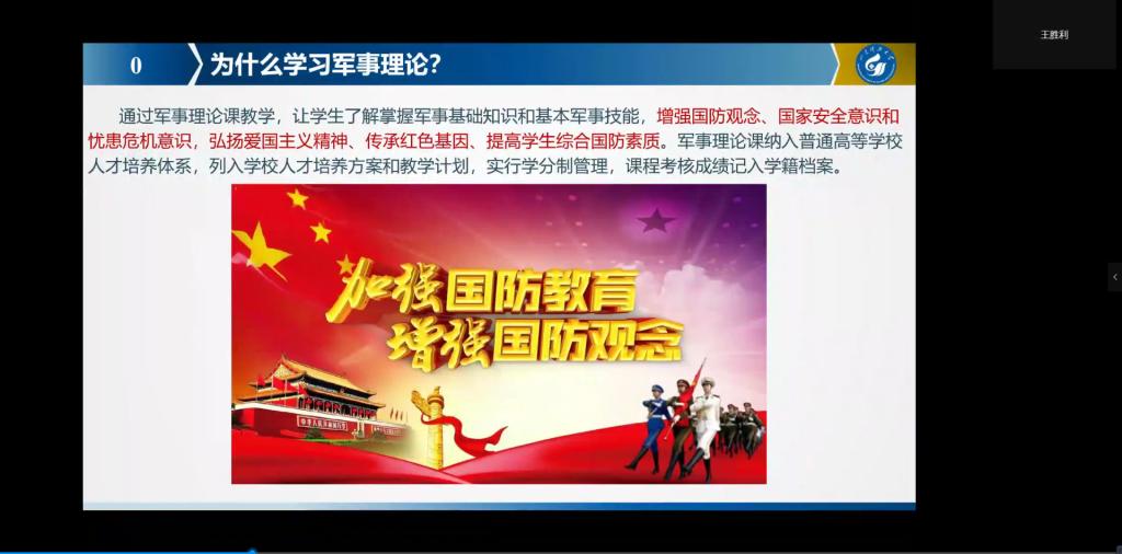 王胜利老师先是从“为什么学习军事理论?”问题出发,从国家战略层面和学生层面为大家分析了学习军事理论的必要性和重大意义,然后以教学大纲为基础,全面详细地讲解了如何针对军事理论课5个专题进行授课。随后,张以良老师从教学规范注意事项和教学资源使用两个方面解答了日常教学过程中调停课申请、多人上课、线上资源使用以及考核等问题。