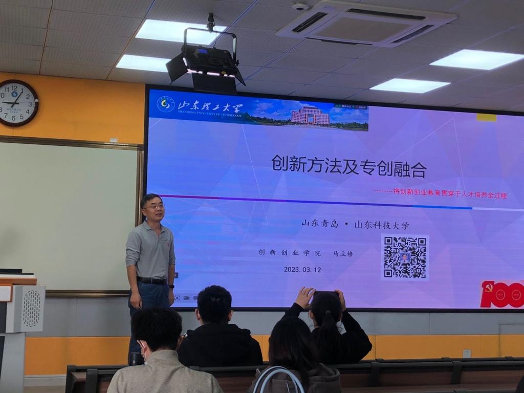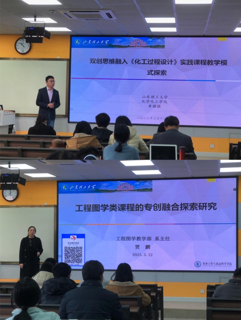 随后,马立修以《创新方法与专创融合——将创新创业教育贯穿于人才培养全过程》为主题的讲座,从宏观介绍了创新方法融入专业课程的意义和途径;山东理工大学化工学院黄耀国、工程图学教学部贾鹏分别以《双创思维融入<化工过程设计>实践课程教学模式探索》、《工程图学类课程的专创融合探索研究》为题从课程设计的实际操作层面进行了分享。